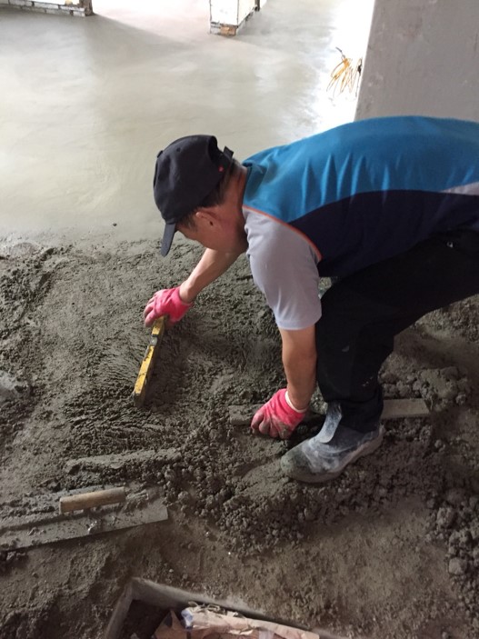 바닥이 울퉁불퉁하지 않게 수평을 잘 맞춰 바닥 미장을 진행합니다