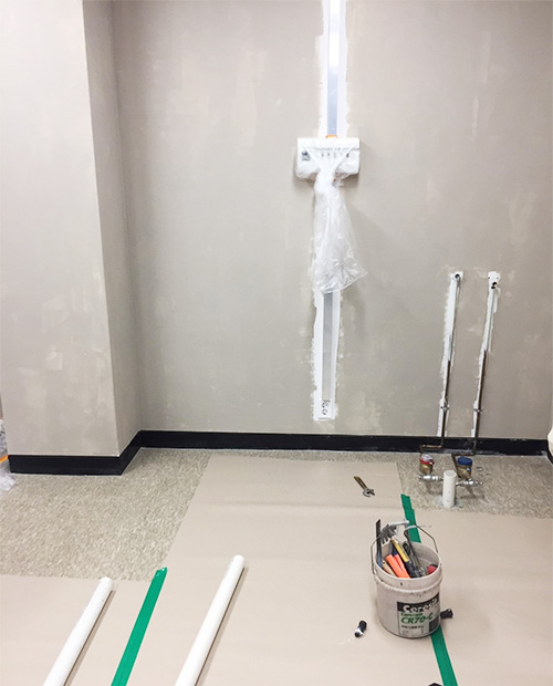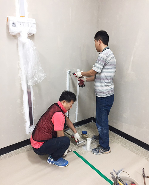 ① 수도를 설치하기 위해 기구의 크기와 간격 그리고 수도가 설치될 높이 등을 고려해 배관을 설치합니다.