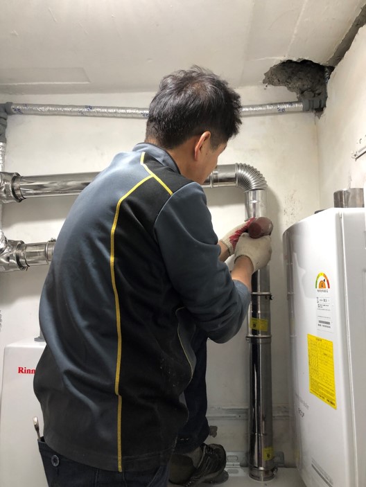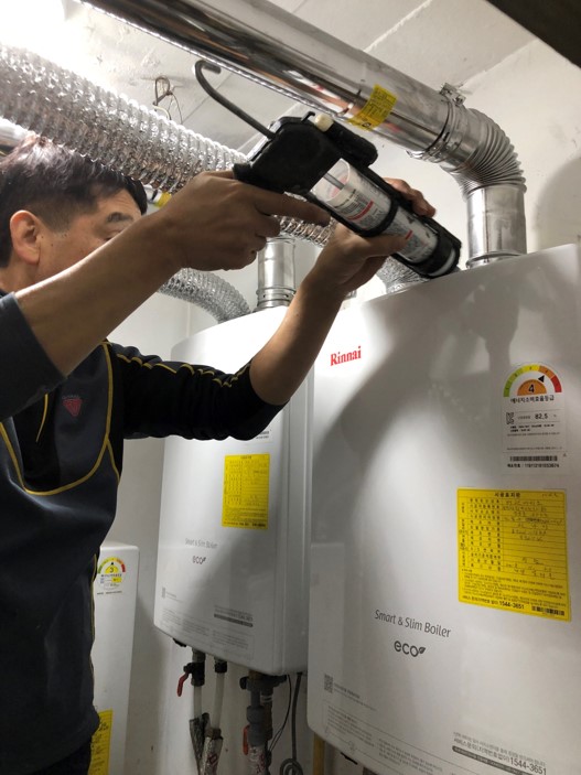 ⑤ 배기통 연결을 완료 후 배기통의 이음매 자리에서 일산화 탄소가 누출되어 연탄가스를 흡입한 것과 같은 인명피해가 발생하는 것을 예방하기 위해 내열실리콘을 사용하여 배기통의 이음매 자리를 마감처리 해줍니다.